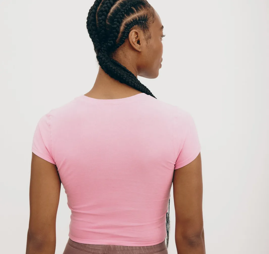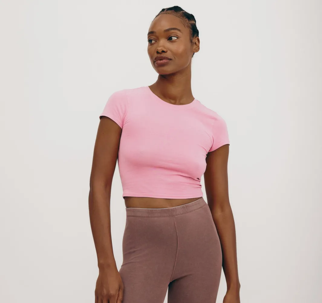 Stretch, baby! This soft, form-fitting tee made with organic cotton features short sleeves and a baby tee fit.