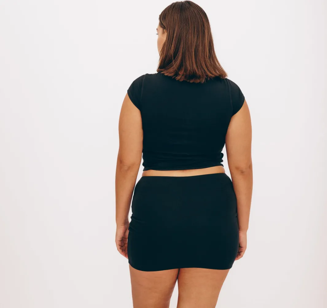An ultra-soft henley tee that hugs you just right. This lightweight and stretchy basic features snap buttons at the neckline and a cropped length that hits at waist-length.