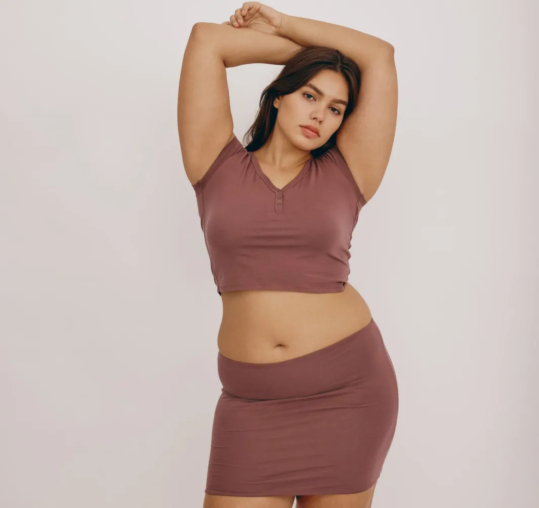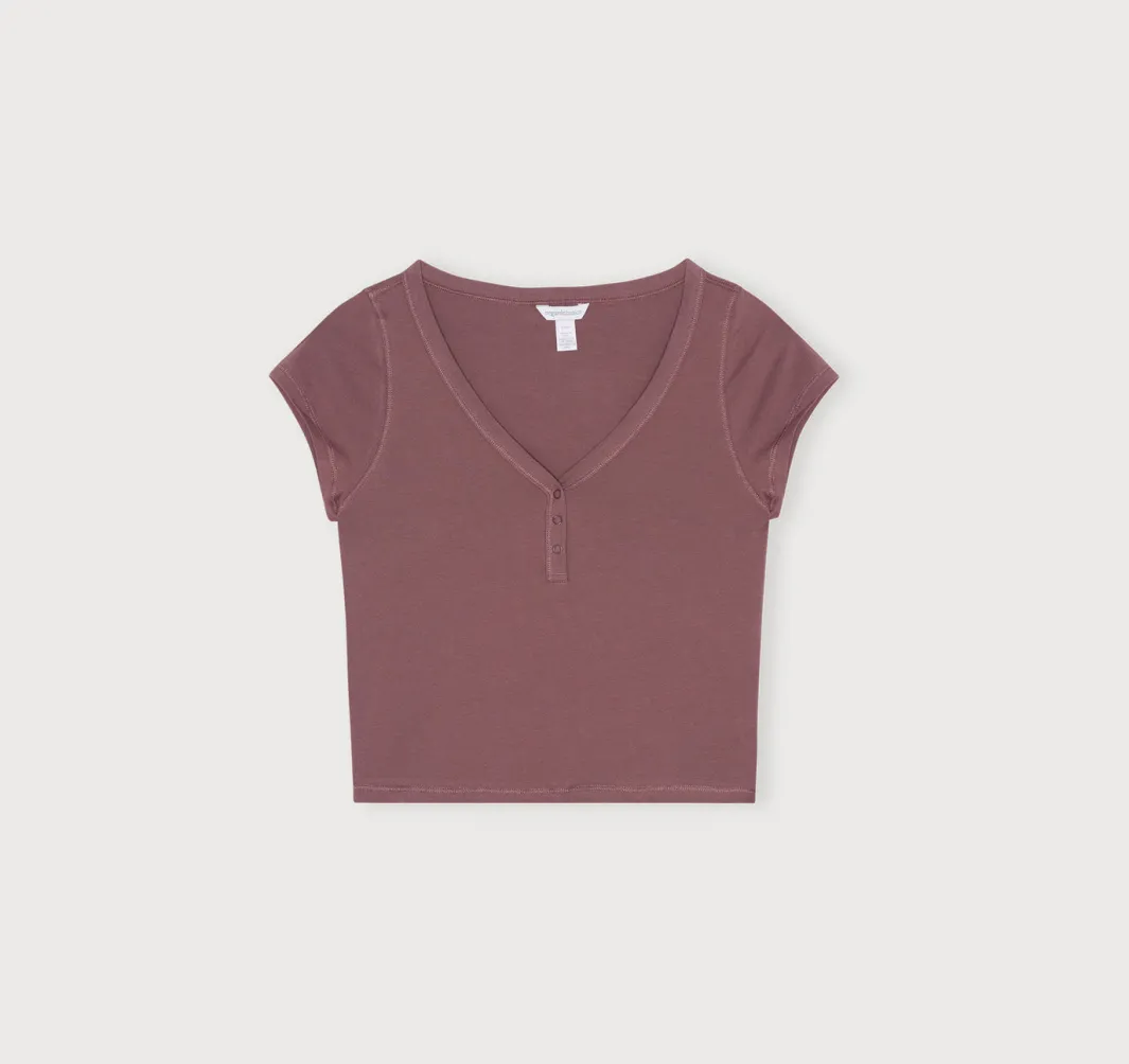 An ultra-soft henley tee that hugs you just right. This lightweight and stretchy basic features snap buttons at the neckline and a cropped length that hits at waist-length.