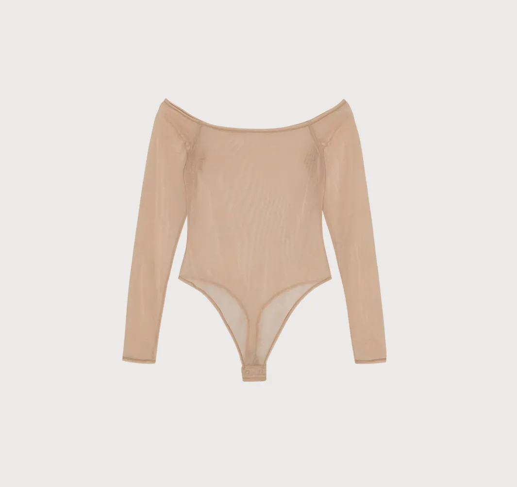 Mesh Off-Shoulder BodysuitMade with GRS-certified recycled nylon this off-shoulder bodysuit is sexy, sustainable, and oh…