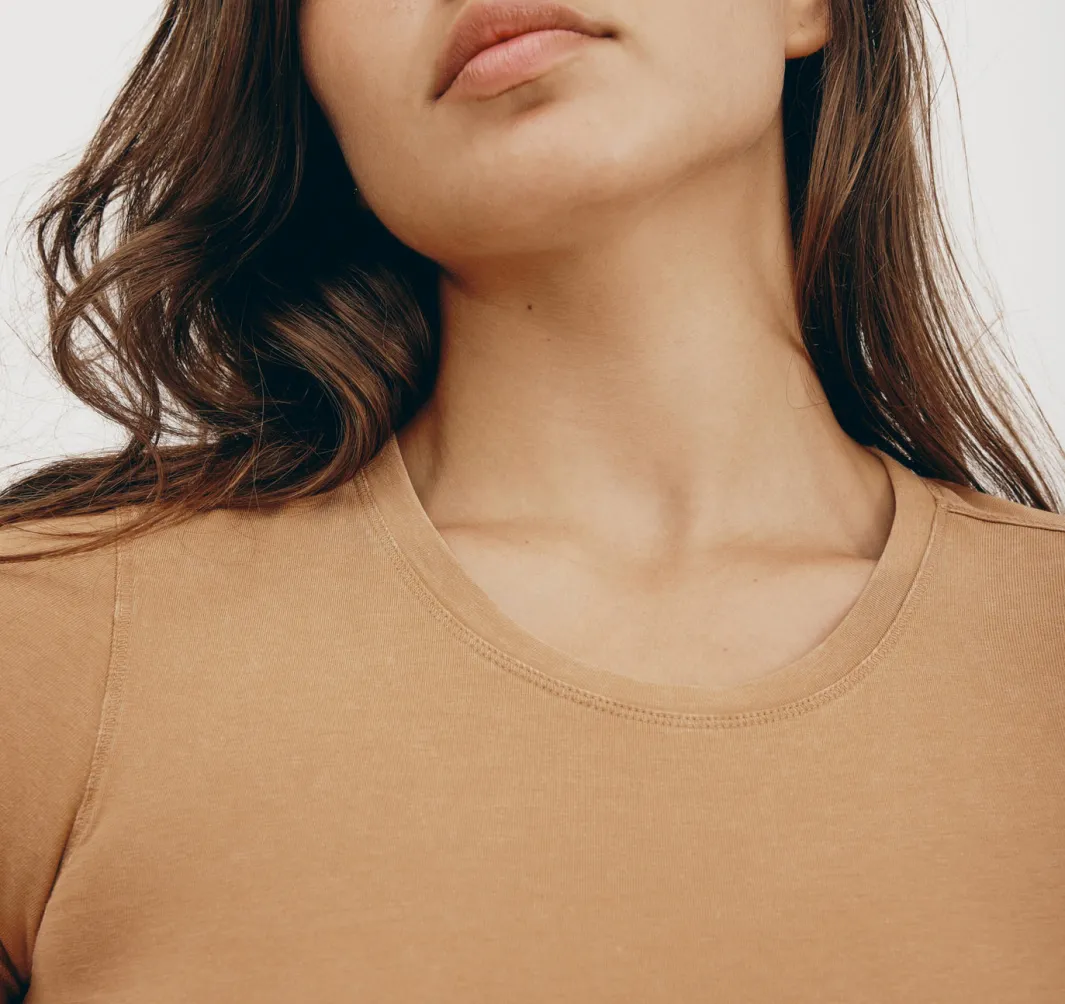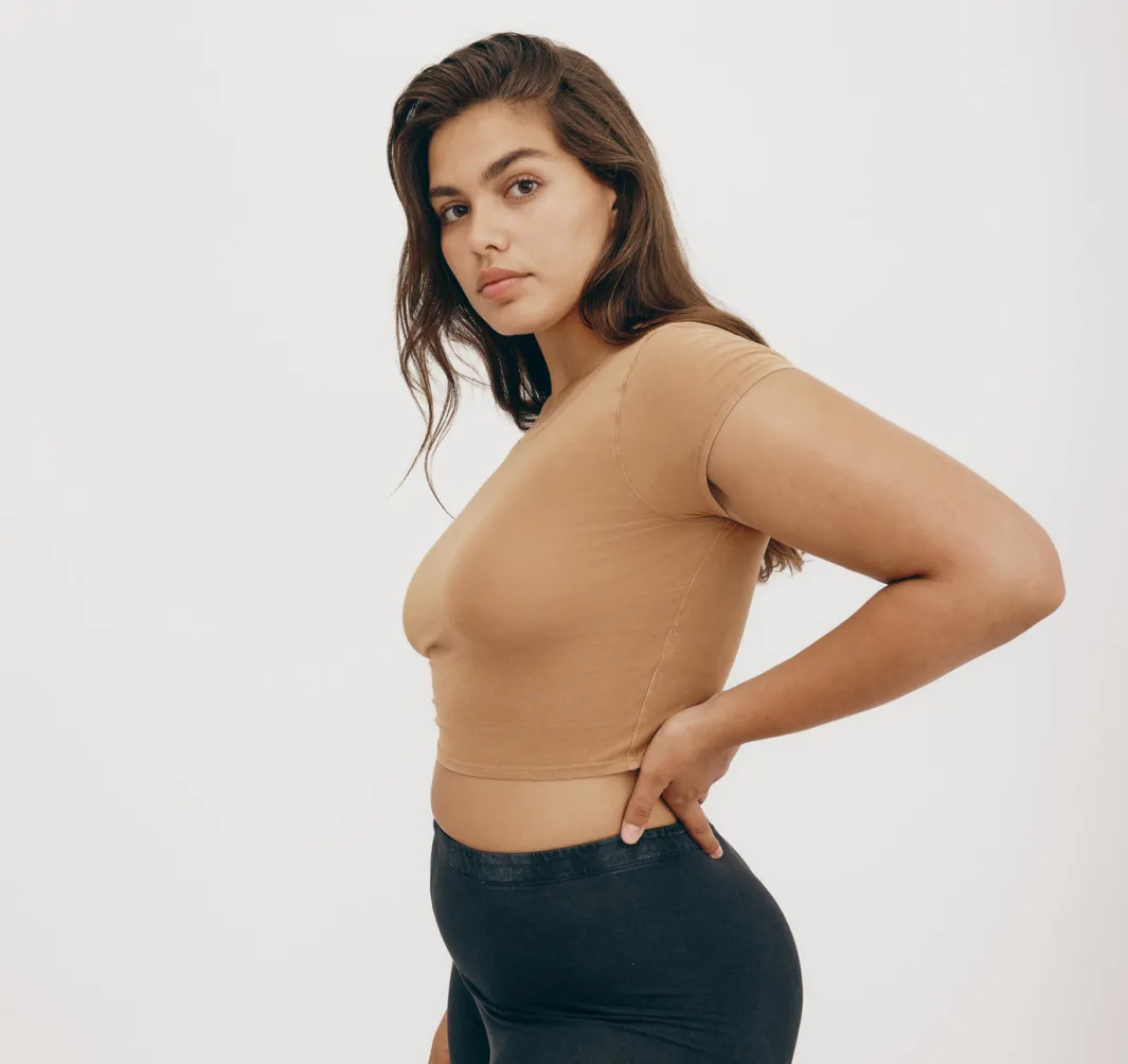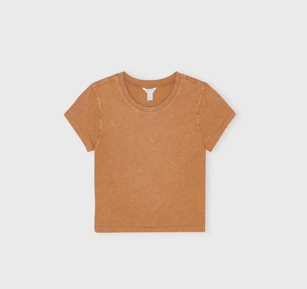 Stretch, baby! This soft, form-fitting tee made with organic cotton features short sleeves and a baby tee fit.