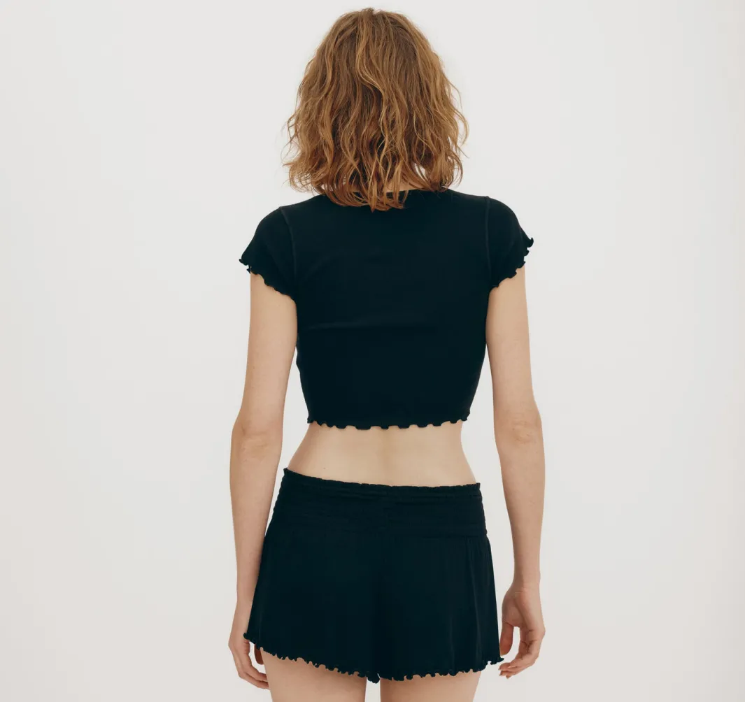 Mini, smocked shorts made with organic cotton in a 5×2 rib. Features a fluttered hem for a delicate look and feel.