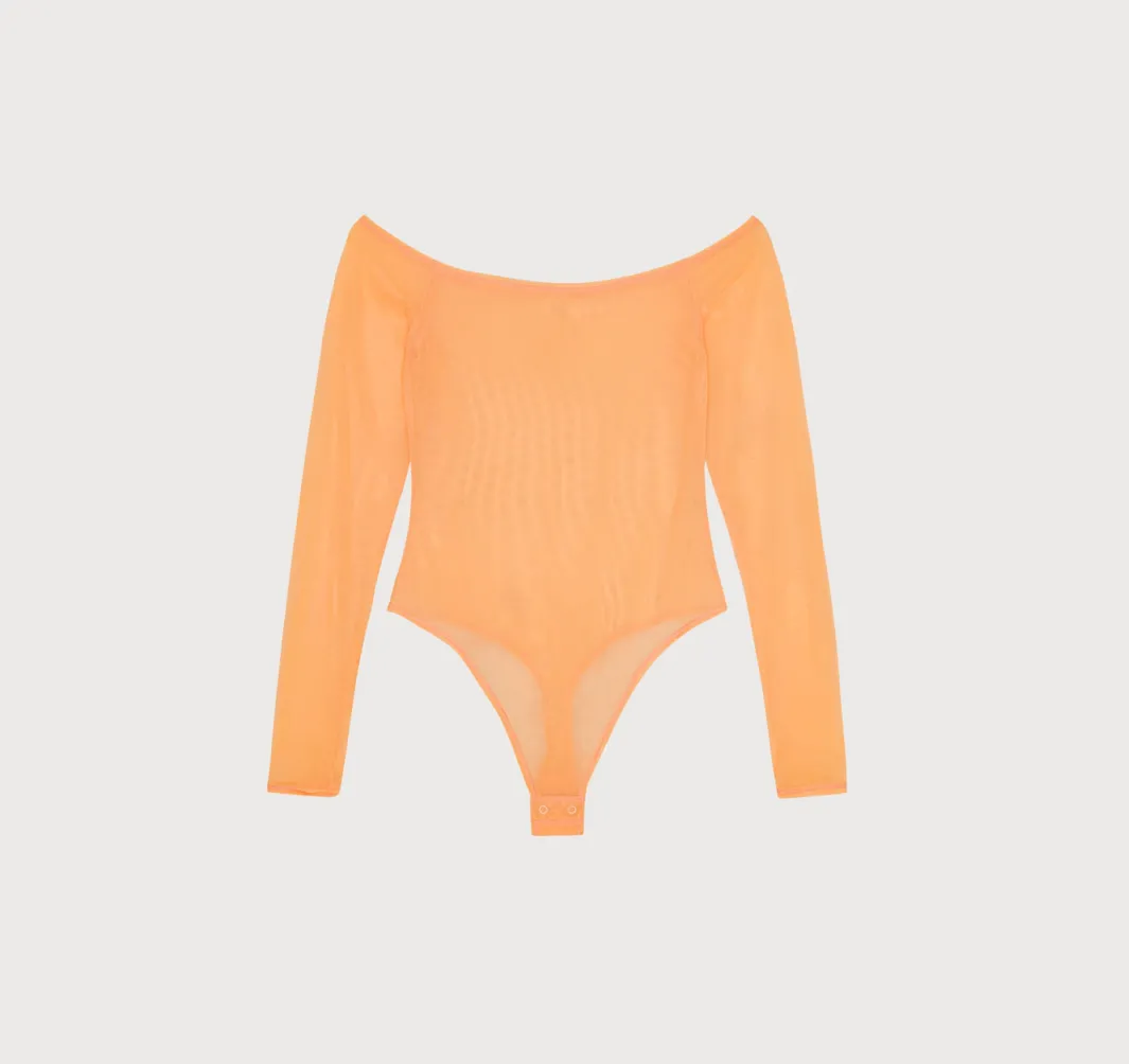 Mesh Off-Shoulder BodysuitMade with GRS-certified recycled nylon this off-shoulder bodysuit is sexy, sustainable, and oh…