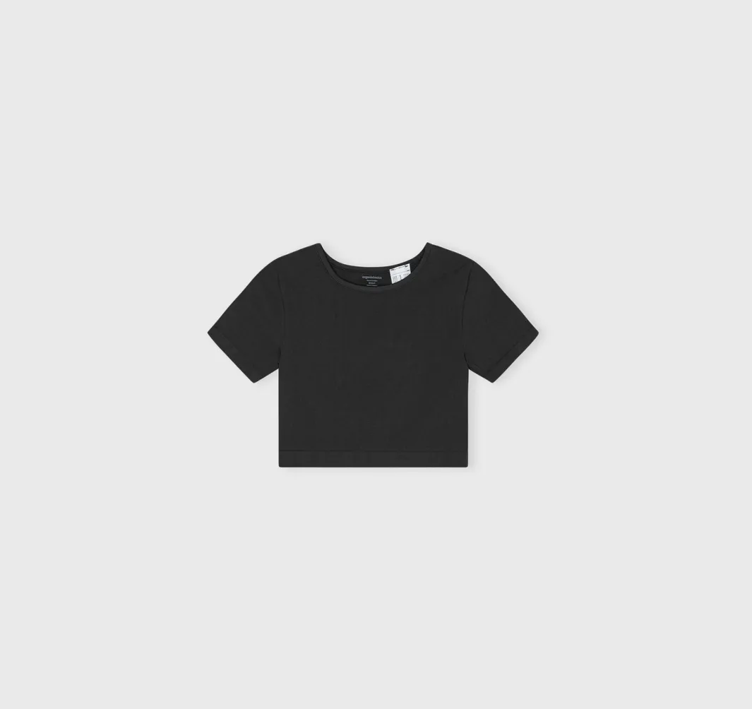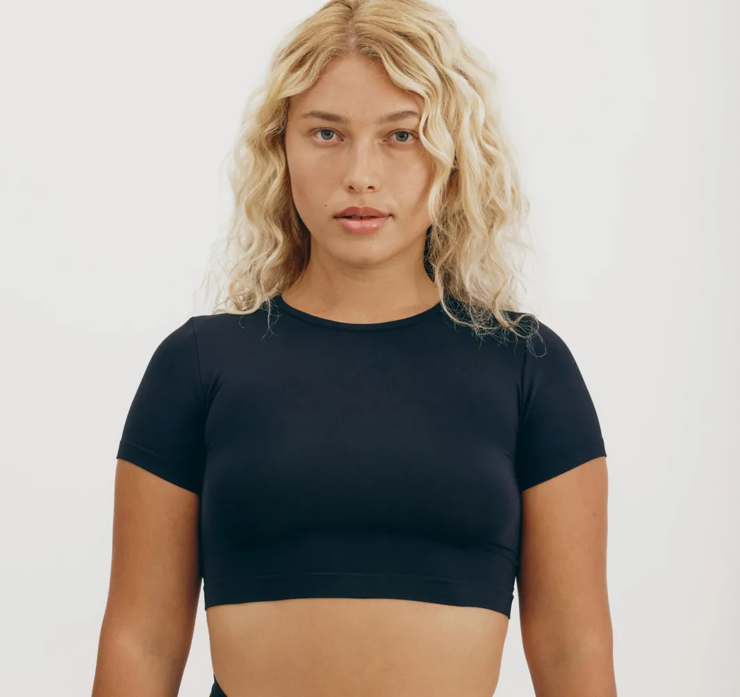 Sleek and seamless, this super-cropped tee has a soft and comfortable fit to take you from lounging and beyond. Made with a scoop neckline in a smooth recycled material.