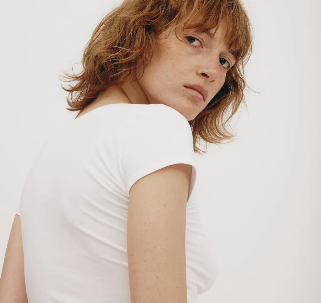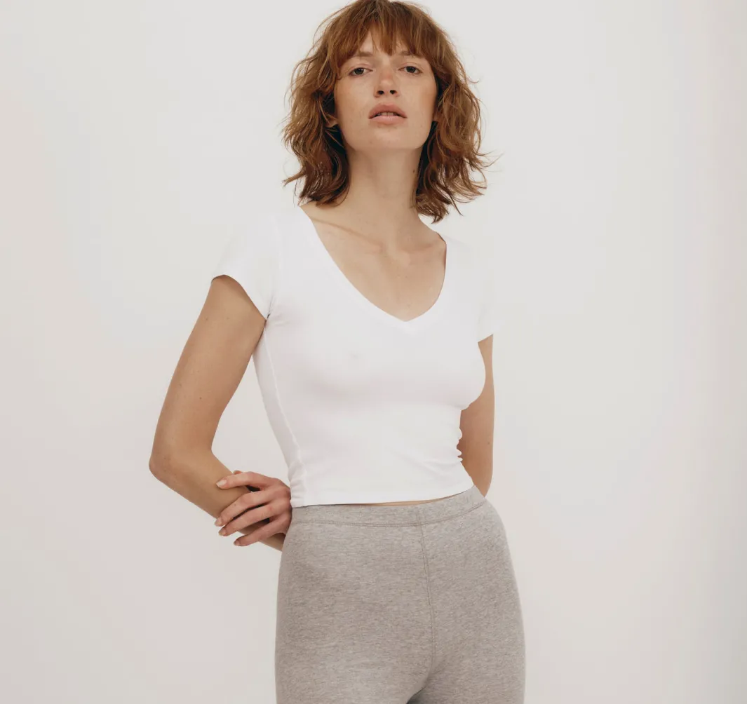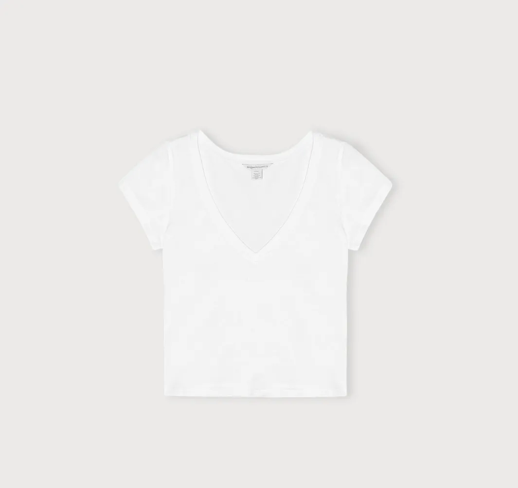 Stretch, baby! This soft, form-fitting v-neck tee made with organic cotton features short sleeves and a baby tee fit.