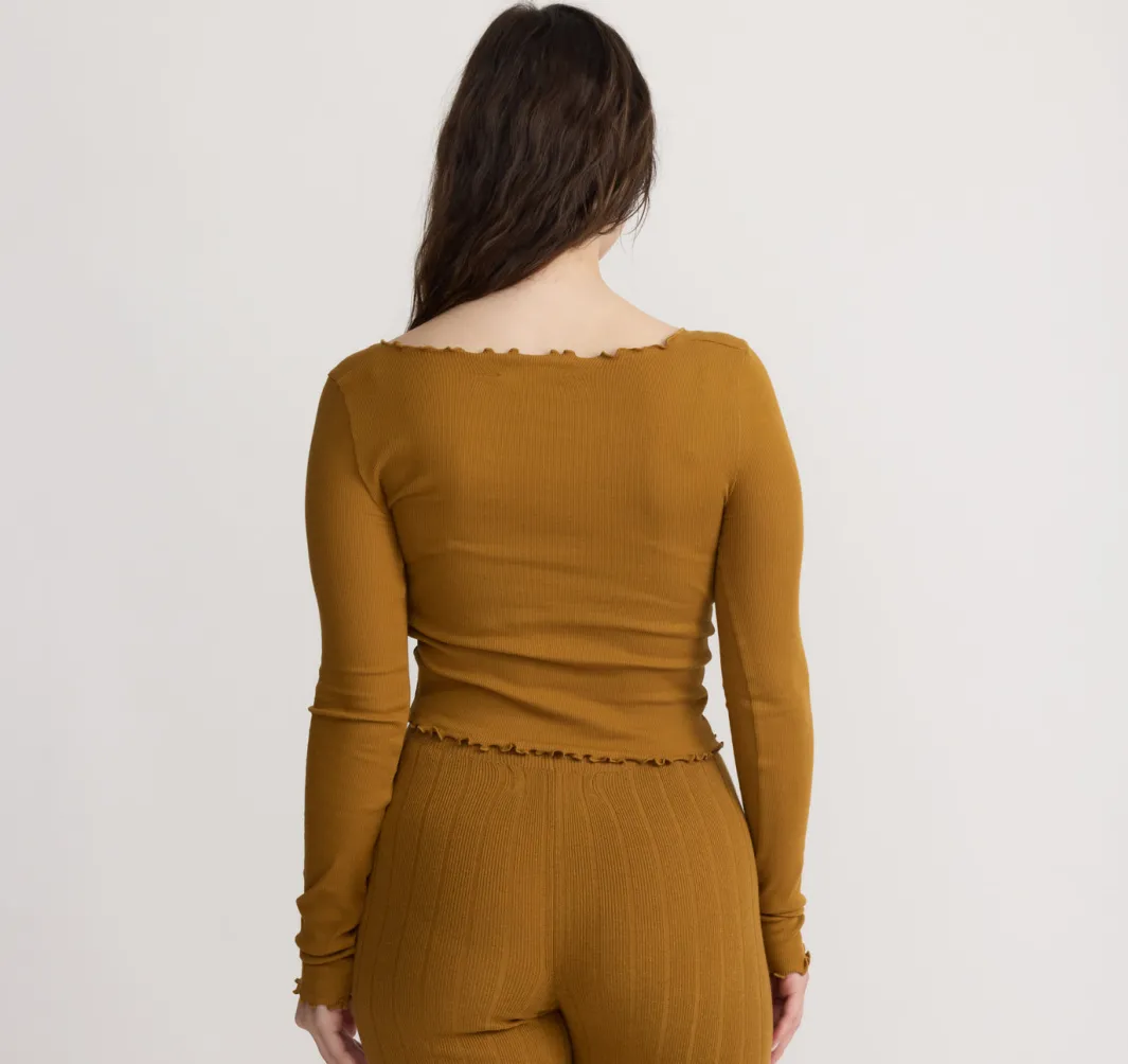 Upgrade your wardrobe with this long sleeve tee made with GOTS-certified organic cotton. Features curled hems and a neckline that is sure to spice up any outfit.