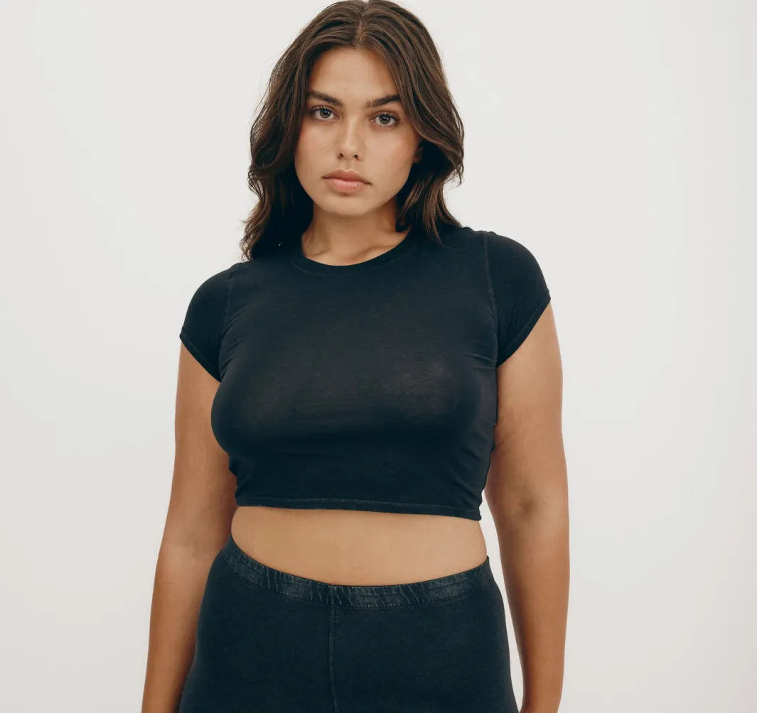 Stretch, baby! This soft, form-fitting tee made with organic cotton features short sleeves and a baby tee fit.