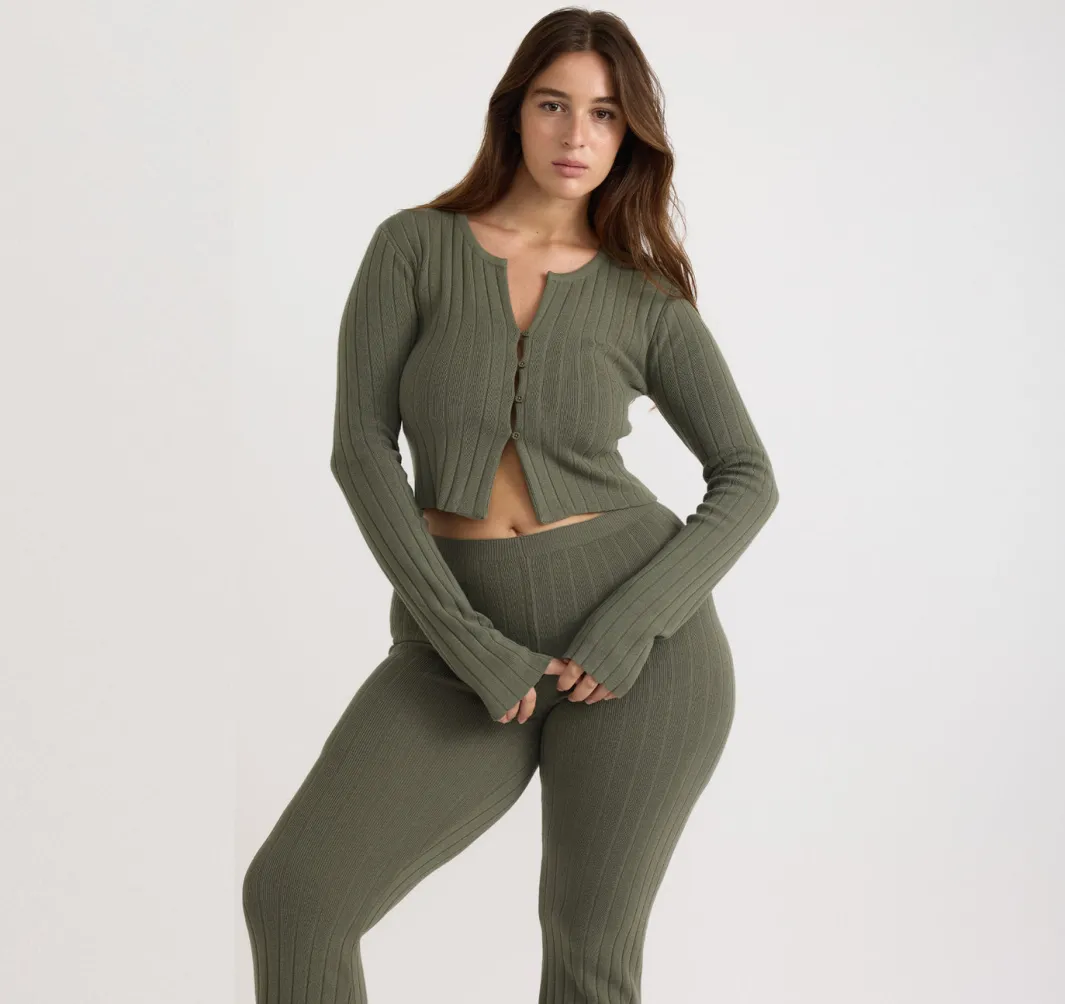 Soft Knit Rib High-Rise Flare Pants70’s inspired flare pants made with organic cotton and recycled nylon for a buttery-s…