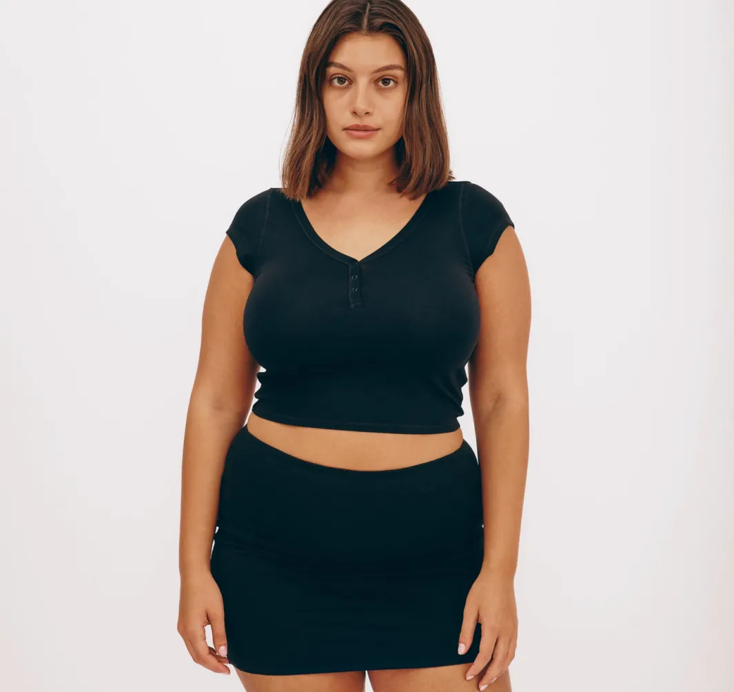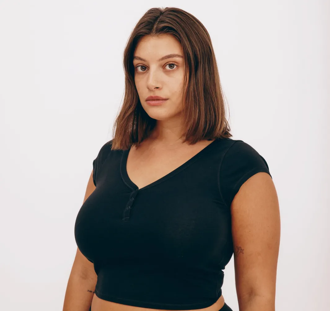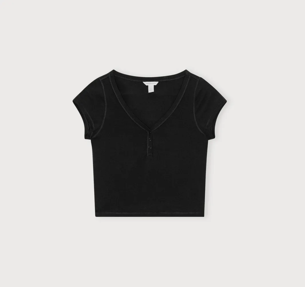 An ultra-soft henley tee that hugs you just right. This lightweight and stretchy basic features snap buttons at the neckline and a cropped length that hits at waist-length.