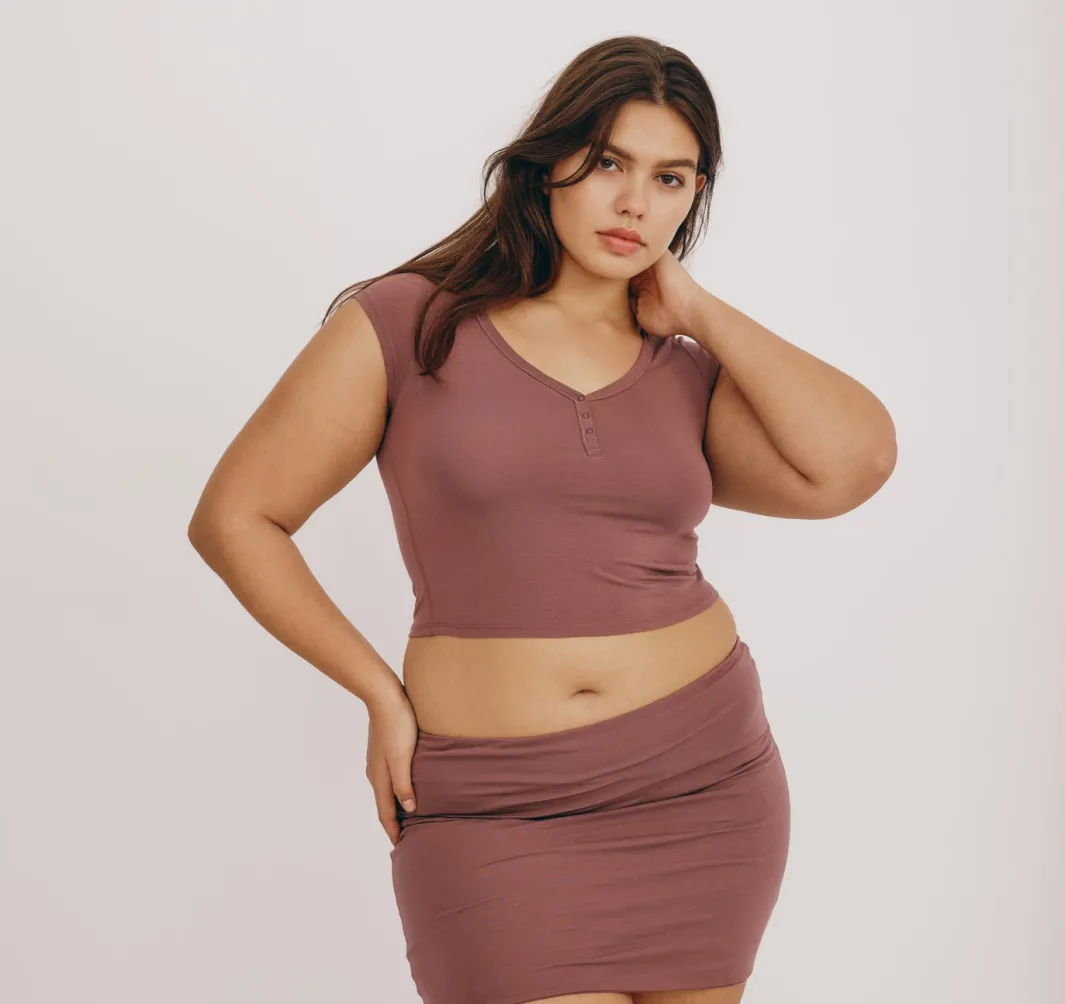 An ultra-soft henley tee that hugs you just right. This lightweight and stretchy basic features snap buttons at the neckline and a cropped length that hits at waist-length.