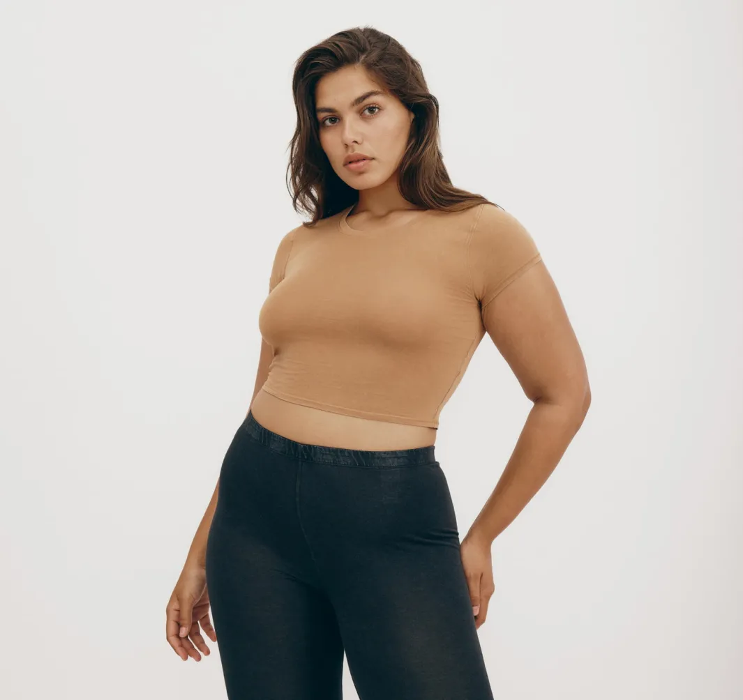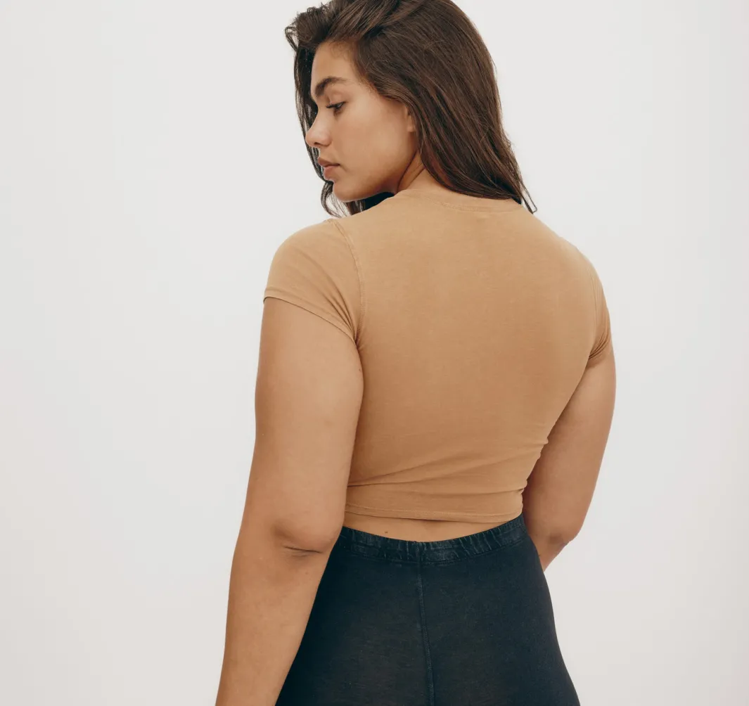 Stretch, baby! This soft, form-fitting tee made with organic cotton features short sleeves and a baby tee fit.