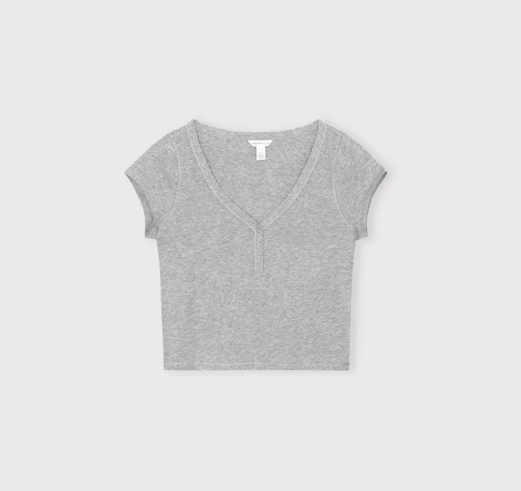 An ultra-soft henley tee that hugs you just right. This lightweight and stretchy basic features snap buttons at the neckline and a cropped length that hits at waist-length.