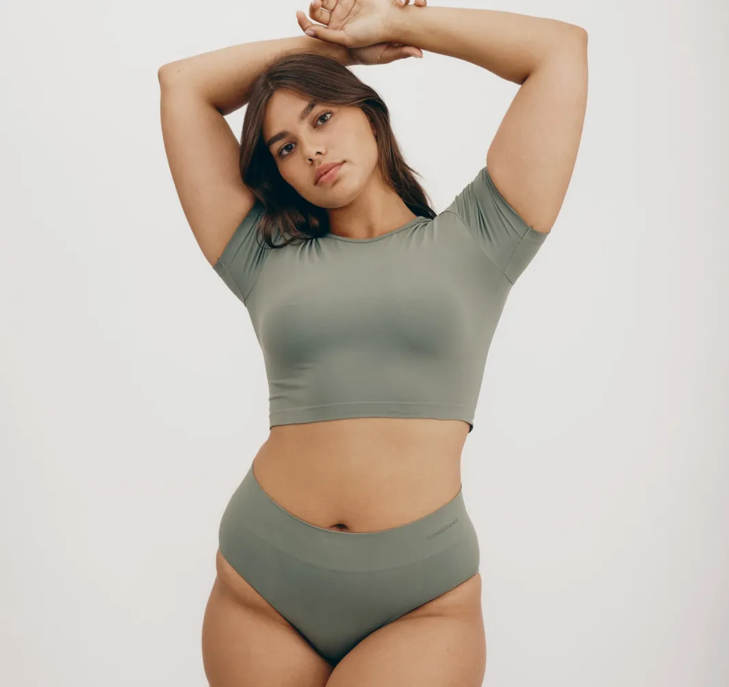 Sleek and seamless, this super-cropped tee has a soft and comfortable fit to take you from lounging and beyond. Made with a scoop neckline in a smooth recycled material.